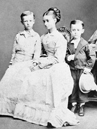 The only portrait photograph of Matilda in existence dates from this journey, and was taken in Bombay just before their departure for Egypt in 1875. It shows a pretty blonde girl in her early thirties in a plain white dress sitting between two of her boys, William and George, aged eight and four and a half respectively. There was obviously no time to buy the boys outfits for the voyage, because William is wearing his hot-weather clothes, while George proudly sports a sailor suit several sizes too big, with huge tucks in the sleeves and trousers, and his feet crammed into boots at least a size too small. Matilda sits relaxed, serene, deep in thought, her mind perhaps contemplating a future without financial worries.